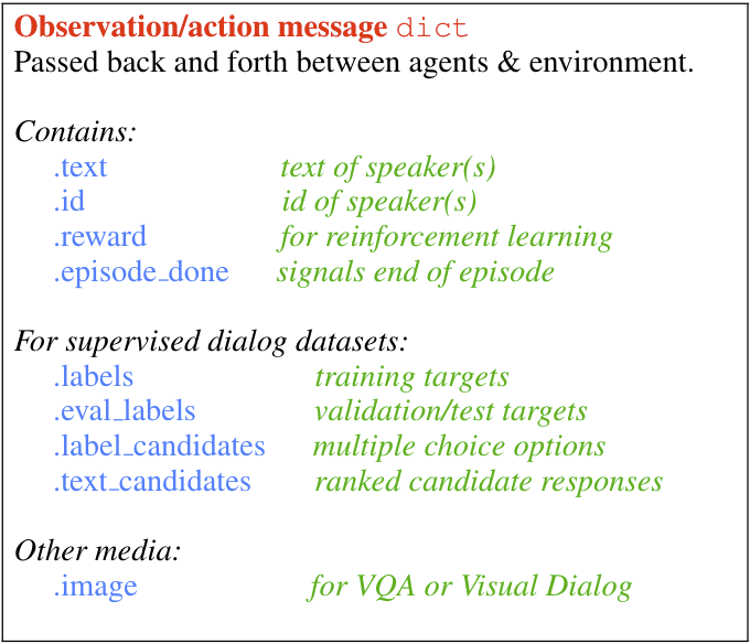 All agents (including teachers) speak to each other with a single format -- the observation/action object (a python dict). This is used to pass text, labels and rewards between agents. It’s the same object type when talking (acting) or listening (observing), but a different view (with different values in the fields). The fields are as follows: