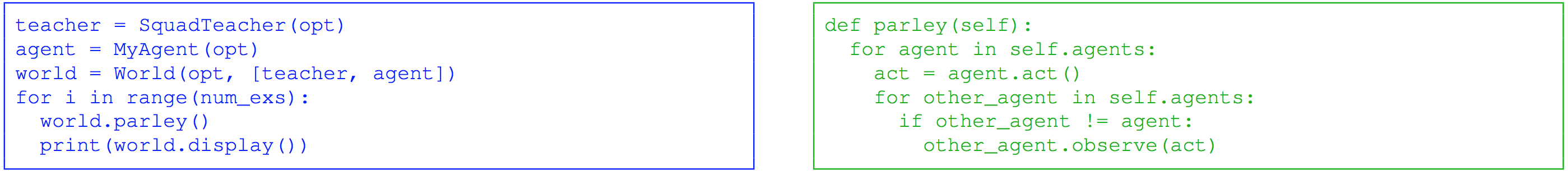 After defining a world and the agents in it, a main loop can be run for training, testing or displaying, which calls the function world.parley(). The skeleton of an example main is given in the left panel, and the actual code for parley() on the right.