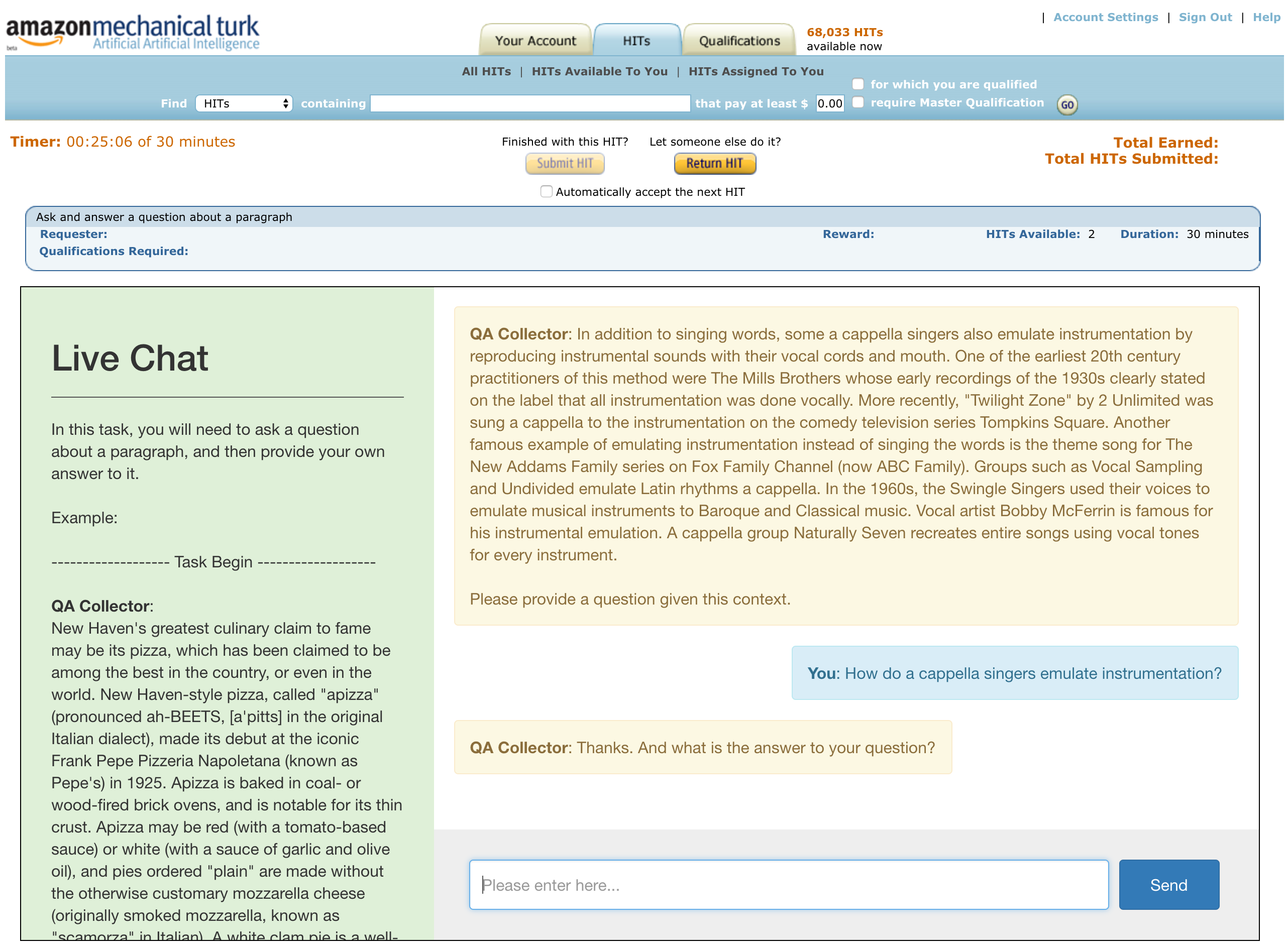 - qa_data_collection: get questions and answers from turkers, given a random paragraph from SQuAD.