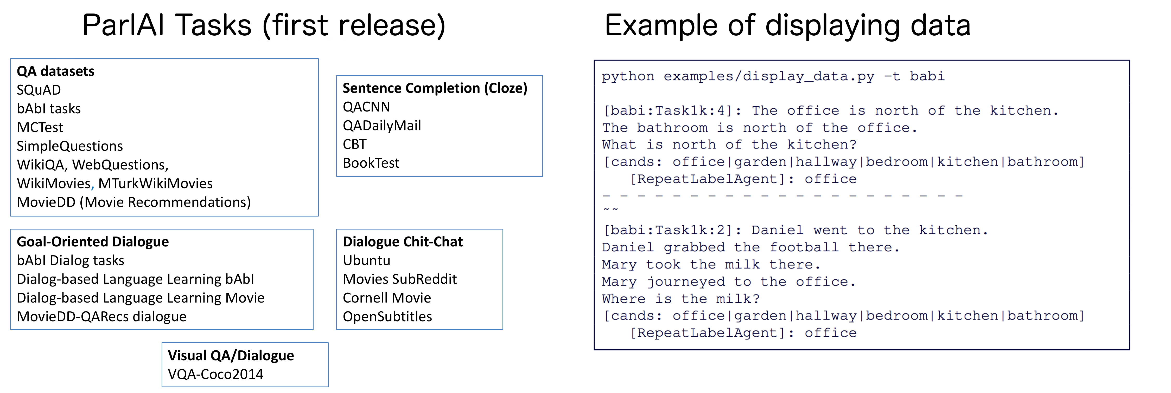 Over 20 tasks are supported in the first release, including popular datasets such as SQuAD, bAbI tasks, MCTest, WikiQA, WebQuestions, SimpleQuestions, WikiMovies, QACNN & QADailyMail, CBT, BookTest, bAbI Dialog tasks, Ubuntu Dialog, OpenSubtitles, Cornell Movie and VQA-COCO2014.